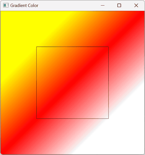 从上图可以看到,渐变色在垂直于渐变线段(中间矩形的左上角和右下角连成的斜线)方向无限扩展,但为什么在渐变范围边界以外还有颜色呢?如左上角的黄色和右下角的白色,这个与渐变的另一个属性特性有关 – 渐变传播,后面章节有详细介绍。