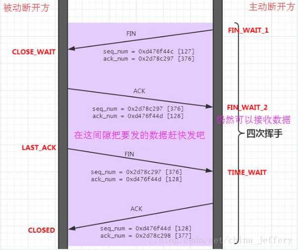 为了让“被动断开方”有机会将想要发送的数据发送完,主动断开方在发送完FIN并收到了ACK确认信息进入FIN_WAIT_2状态后,只关闭了发送功能了,但仍然保留接收功能。这样“被动断开方”就有机会将没有发送完的数据发送完成,发送完成之后,“被动断开方”也发送一个FIN,相当于告诉“主动断开方”:“我的数据已经发完了呀,以后不会再发数据了,你可以安心的把接收功能关闭了,另外我自己也要关闭了呀”。