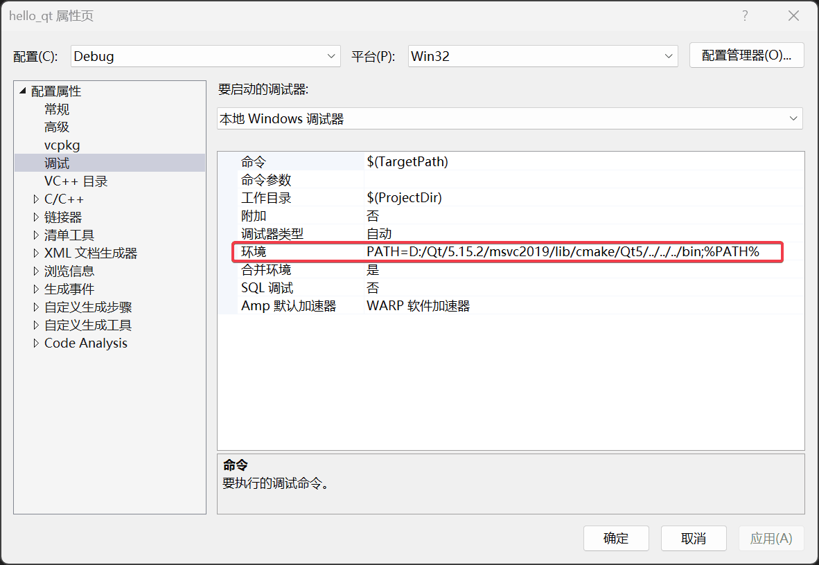 而设置 VS_DEBUGGER_ENVIRONMENT 属性是为了设置 Visual Studio 的调试环境(如下图所示),确保在调试时能找到 Qt 的相关 dll 文件。