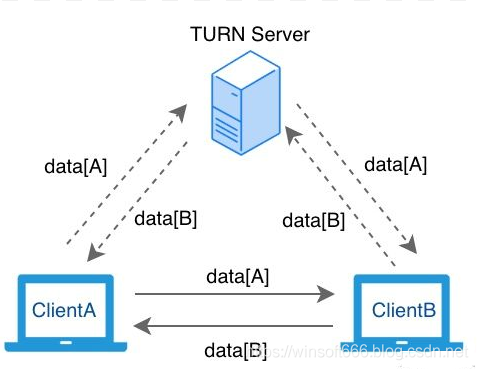 WebRTC 是基于 P2P 的实时通信技术,(如果 P2P 打洞失败,则会使用 TURN 服务器进行数据转发),在有 2 台客户端参与的情况下,网络拓扑结构如图: