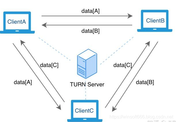 在只有 2 个客户端参与情况下,我们可以使用上图的这种拓扑结构。但假如同时有 3 个客户端参与(如多人视频会议),如果还是按照上面的方式,拓扑结构就会变成: