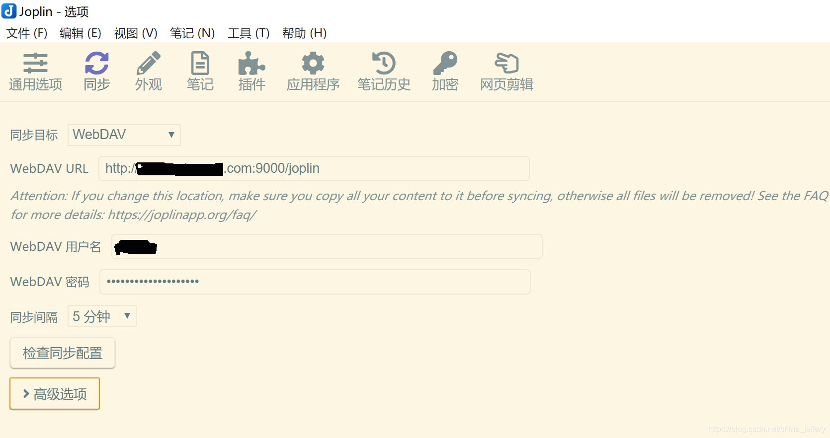 从Joplin官网(https://joplinapp.org/)下载Joplin客户端,在“同步”选项中设置WebDAV,如图所示: