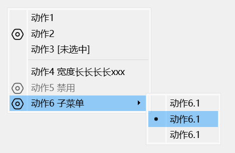 1 2 3 4 5 6 7 8 9 10 11 12 13 14 15 16 17 18 19 20 21 22 23 24 25 26 27 28 29 30 31 32 33 34 35 36 37 38 39 40 41 42 43 44 45 46 47 48 49 50 51 52 53 54 55 56 57 58 59 60 QIcon settingIcon (":/MenuBeauty/setting.png" ) ;QAction* action1 = new QAction ("动作1" ); QAction* action2 = new QAction (settingIcon, "动作2 有图标" ); QAction* action3 = new QAction ("动作3 [未选中]" ); action3->setCheckable (true ); action3->setChecked (false ); connect (action3, &QAction::triggered, this , [action3](bool checked) { action3->setText (checked ? "动作3 [选中]" : "动作3 [未选中]" ); }); QAction* action4 = new QAction ("Action4 动作四测试" ); QAction* action5 = new QAction (settingIcon, "动作5 禁用" ); action5->setEnabled (false ); QAction* action6 = new QAction (settingIcon, "动作6 子菜单" ); { QAction* action6_1 = new QAction ("动作6.1" ); action6_1->setCheckable (true ); QAction* action6_2 = new QAction ("动作6.1" ); action6_2->setCheckable (true ); QAction* action6_3 = new QAction ("动作6.1" ); action6_3->setCheckable (true ); QMenu* action6SubMenu = new QMenu (this ); action6SubMenu->addAction (action6_1); action6SubMenu->addAction (action6_2); action6SubMenu->addAction (action6_3); QActionGroup* action6Group = new QActionGroup (this ); action6Group->setExclusive (true ); action6Group->addAction (action6_1); action6Group->addAction (action6_2); action6Group->addAction (action6_3); action6->setMenu (action6SubMenu); } QMenu* menu = new QMenu (this ); menu->addActions ({action1, action2, action3}); menu->addSeparator (); menu->addActions ({action4, action5, action6}); this ->setContextMenuPolicy (Qt::CustomContextMenu);connect (this , &QWidget::customContextMenuRequested, this , [this , menu](const QPoint& pos) { menu->exec (this ->mapToGlobal (pos)); });