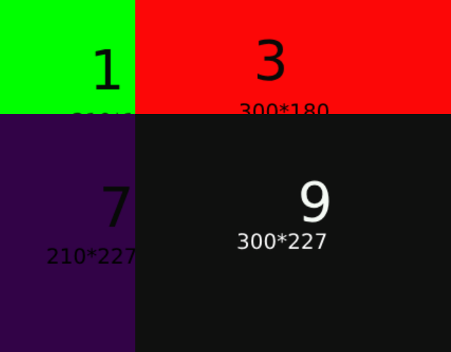该方案会始终保持1、3、7、9四个区域图片的宽高不变,如1号区域是210*180,当我们对图片进行放大时,这个行为是没有问题的,但当我们缩小图片时,缩小后的图片宽高不足以容纳4个顶角图片时,缩小操作就会出现非预期的行为,可能如下图所示: