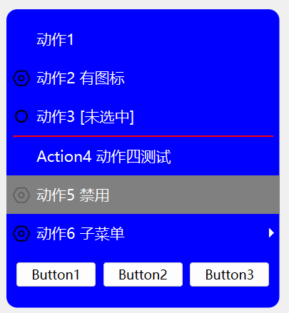 1 2 3 4 5 6 7 8 9 10 11 12 13 14 15 16 17 18 19 20 21 QWidgetAction* action7 = new QWidgetAction (this ); { QWidget* widget = new QWidget (); QHBoxLayout* hl = new QHBoxLayout (widget); auto createPushButtonFn = [this ](QString title) { QPushButton* btn = new QPushButton (title); connect (btn, &QPushButton::clicked, this , [this ]() { QMessageBox::information (this , "Clicked" , ((QPushButton*)sender ())->text ()); }); return btn; }; hl->addWidget (createPushButtonFn ("Button1" )); hl->addWidget (createPushButtonFn ("Button2" )); hl->addWidget (createPushButtonFn ("Button3" )); action7->setDefaultWidget (widget); } menu->addAction (action7);