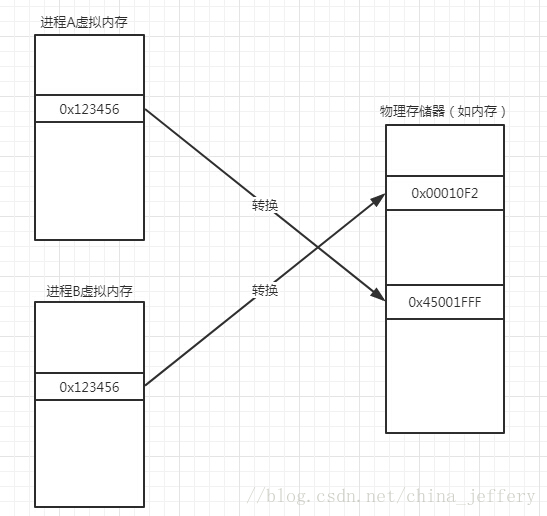 从图上可以看出,进程 A 和 B 虽然都有地址0x123456,但它们分别对应的物理地址不一样。