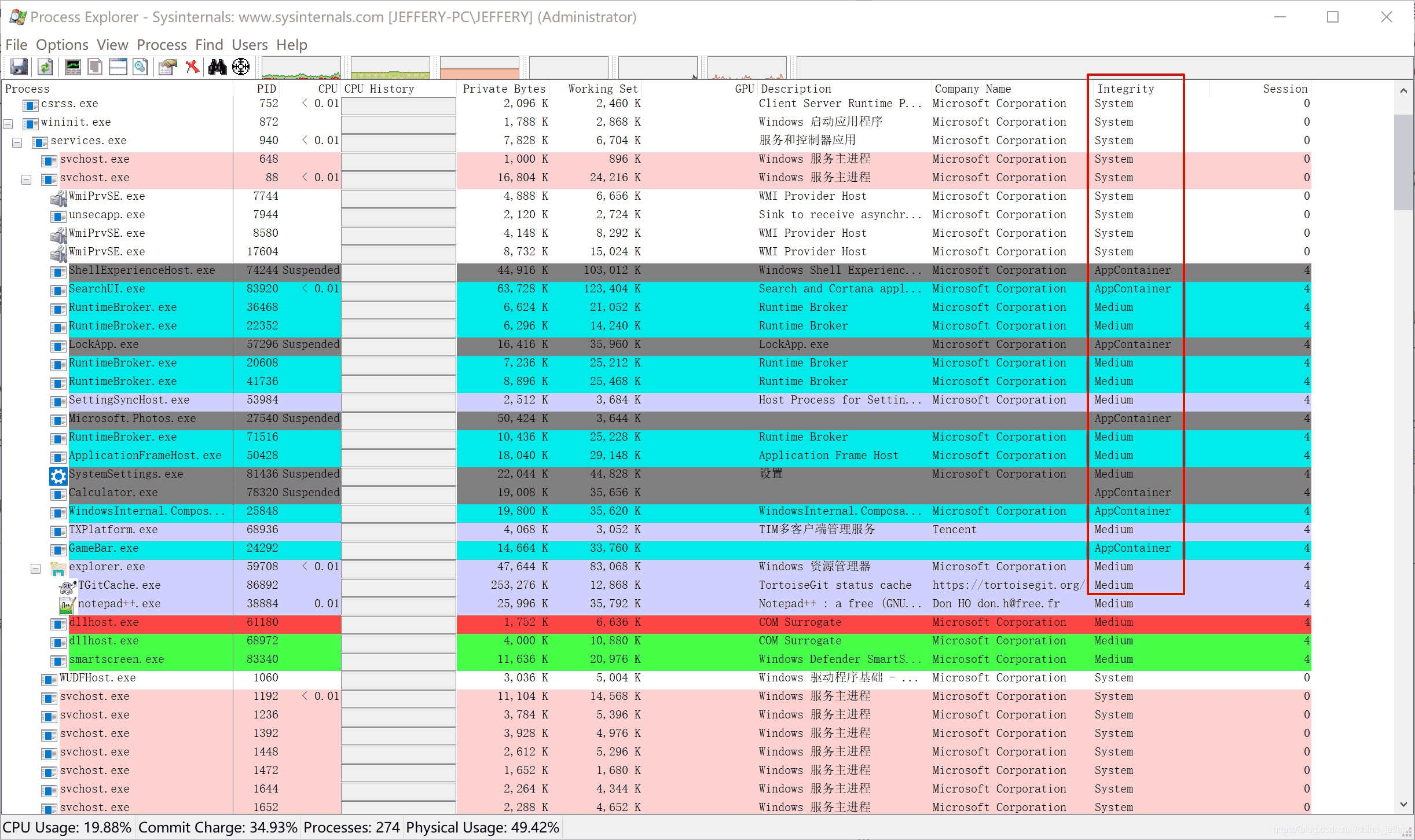 系统中会运行多种不同类型、不同特权等级的进程(当然,从技术上讲这两个进程都是在同一用户下)。我们可以使用Windows Sysinternals工具集中的Process Explorer查看各个进程的特权等级。
