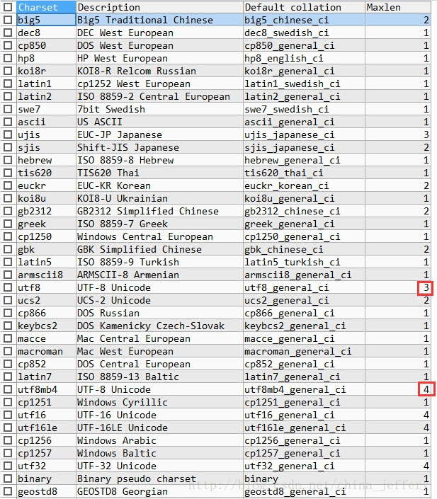 UTF-8 是多字节编码方案,采用 1~4 个字节来存储一个字符,但在 MySQL 设计之初,一个字符最多采用 3 个字节的就可以存储,所以 Mysql 的设计者将 MySQL 中的 UTF-8 字符集(UTF-8 其实不是字符集,是字符编码方案,但在 MySQL 中一直这么叫)设计成了最大长度只能为 3. 如图: