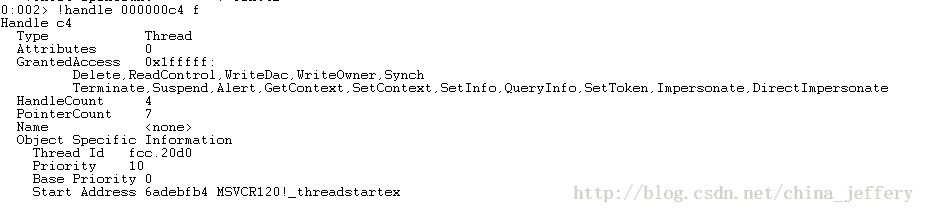 !handle 000000c4 f 命令查看 000000c4 句柄的信息: