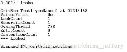 !locks没有显示 LockSemaphore 字段,我们可以通过!cs -l命令获取更为全面的关键区信息: