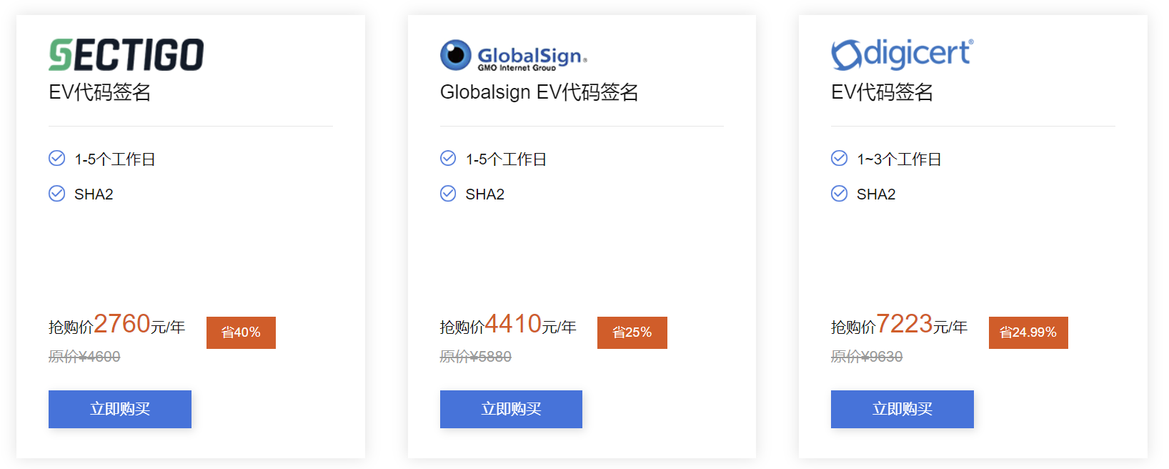 打开任何一个数字证书售卖网站都可以看到它们通常将数字证书分为两个大类:SSL证书和数字签名证书。