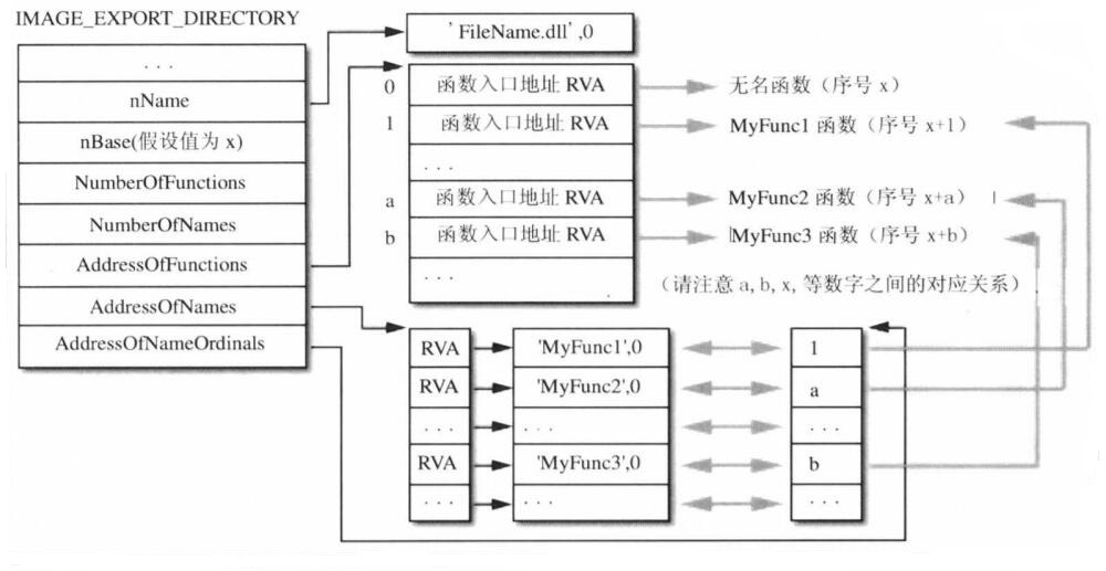 AddressOfNames 字段所指向的表中存储了导出函数的名称(按序号导出的函数不在该表),而 AddressOfFunctions 字段所指向的表中存储了每个函数的地址(包含按名称导出和按序号导出的函数)。因此 AddressOfNames 和 AddressOfFunctions 表不是一一对应的关系,AddressOfFunctions 表中的元素可能比 AddressOfNames 表多。它们之间通过 AddressOfNameOrdinals 表建立连接,AddressOfNames 与 AddressOfNameOrdinals 表是一一对应的关系,通过 AddressOfNames 表的索引可以在 AddressOfNameOrdinals 表中查询到函数在 AddressOfFunctions 表中的索引。