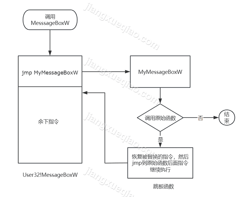 在任何时候,需要调用原始 MessageBoxA 时,直接调用 MessageBoxA_Trampoline 即可。