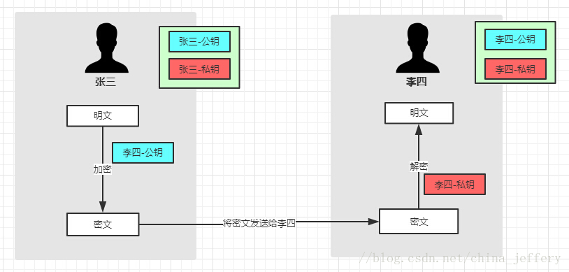 如上图,因为李四的“公钥”是公开的,所以张三要给李四发送信息,可以使用李四的“公钥”来加密信息。李四收到密文信息之后就可以使用自己的“私钥”来解密信息。因为其他人没有李四的“私钥”,所以就算密文信息被他人截获也无法解密。