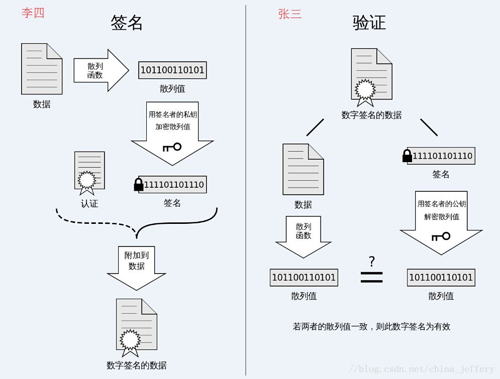 发送者“李四”对数据生成摘要信息(摘要明文A),然后使用“李四”的“私钥”加密摘要信息;接收者“张三”收到加密的摘要信息之后: