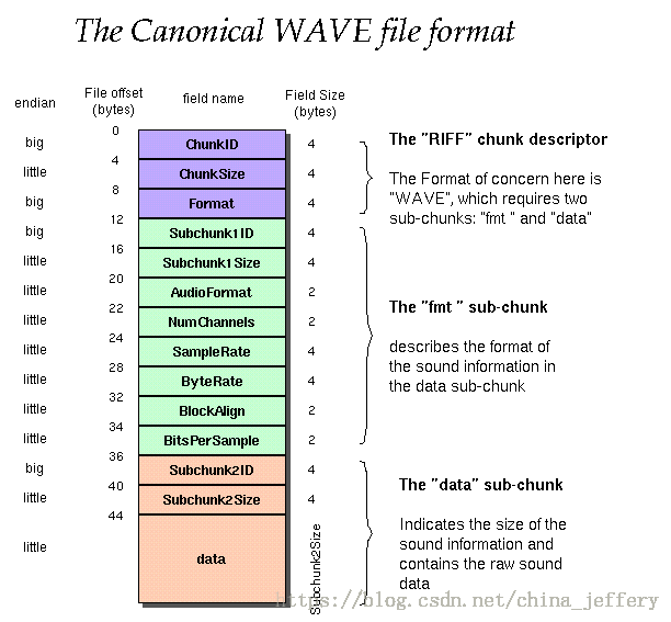 | 12 | 4 | Subchunk1ID | “fmt “串,十六进制大端表示为 0x666d7420 |
