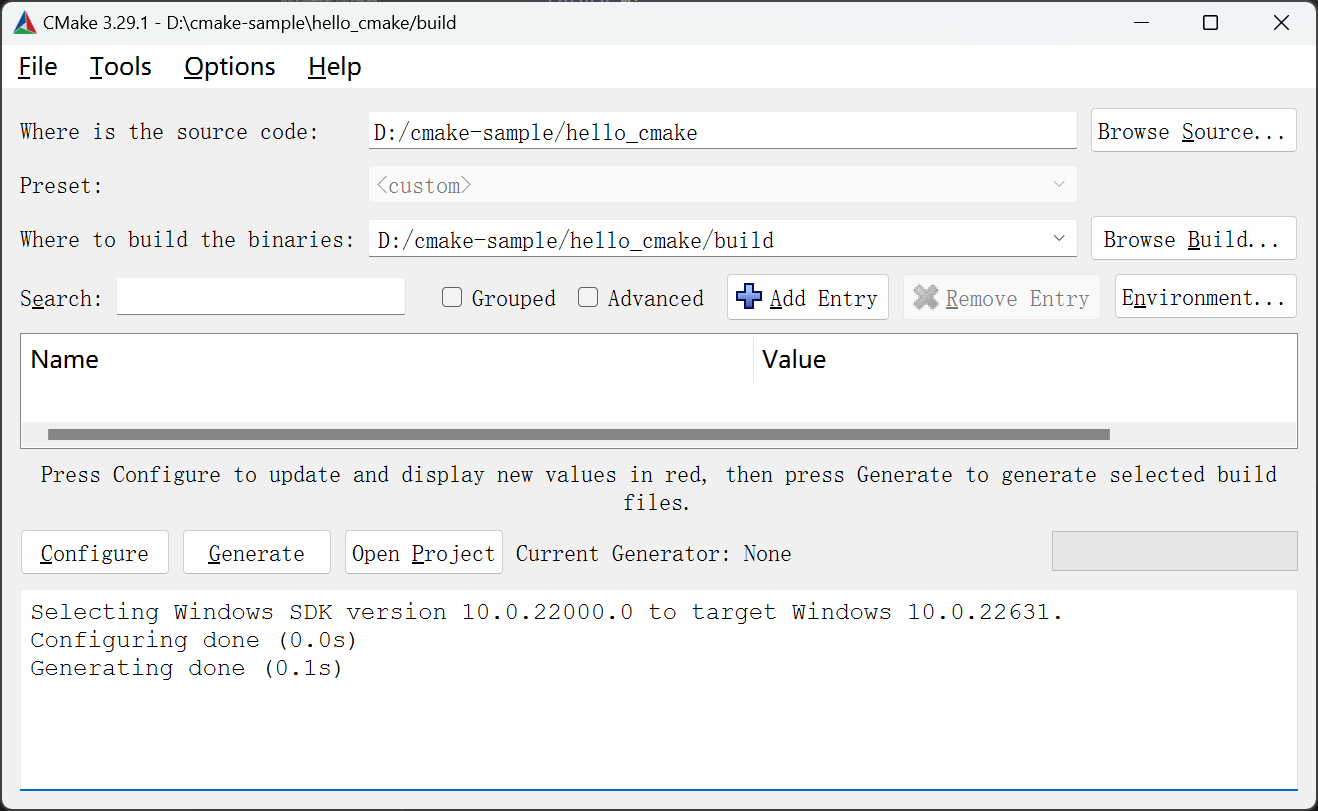 完成上面步骤,我们就可以使用 CMake GUI 或命令行(当然你需要提前安装 CMake,这不在本文的介绍范围之内)就可以生成相应的工程了。
