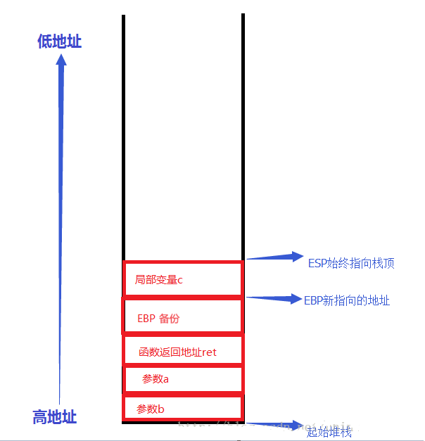 上图中,EBP和函数返回地址ret都是 32 位地址,堆栈中备份了老的EBP值,在函数调用完之后会将EBP恢复为备份在堆栈中的老EBP值,所以从调用者角度来看,在函数的调用开始前和结束后,EBP是不会变化的。