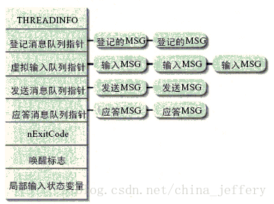 上图描述了THREADINFO结构中的各个成员。线程拥有了THREADINFO结构也就有了各种消息队列。