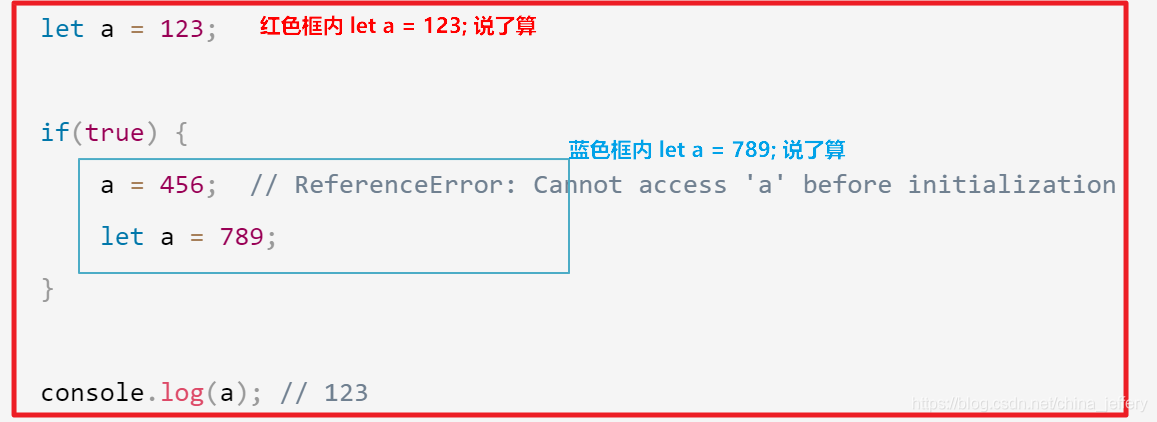 我用let a = 789;在蓝色区域内声明了变量a,那么在这个蓝色区域的一亩三分地内的都是我说了算,a = 456;敢在我还没声明前都赋值,那我还不给你报个错。