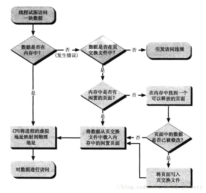 《Windows 核心编程》第 13 章关于“物理存储器和页交换文件”章节中讲到了“页交换文件、物理存储器之间的数据交换过程”,流程如下: