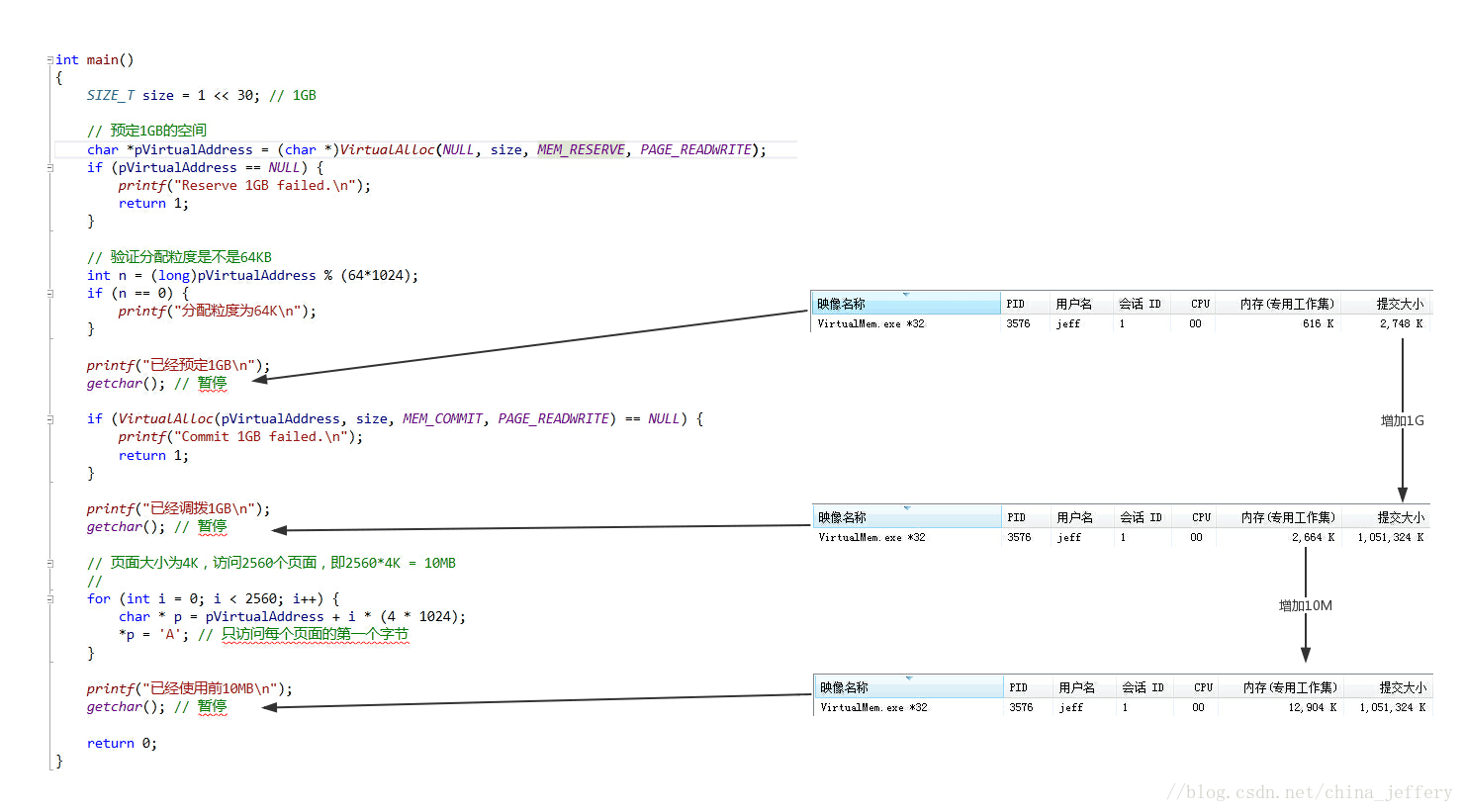 在程序运行各个阶段进程的内存情况如下图:(“内存专用工作集”表示占用的物理内存的大小,“提交大小”表示调拨的页交换文件的大小)