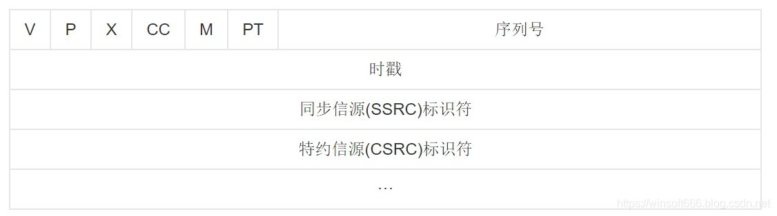 - 同步信源(SSRC)标识符:占 32 位,用于标识同步信源。该标识符是随机选择的,参加同一视频会议的两个同步信源不能有相同的 SSRC。