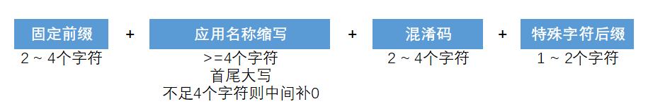 混淆码则根据应用名称缩写长度(补零之前的长度)的不同而不同,需要自己定义一套规则,如: