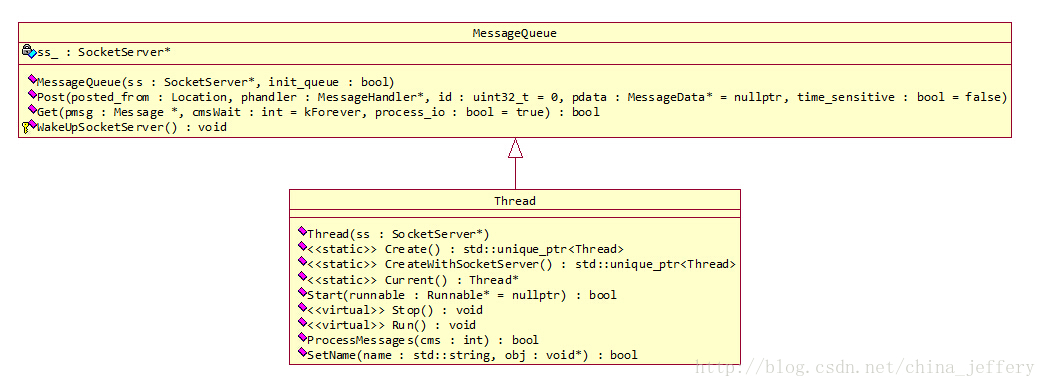 WebRTC的线程功能由Thread类提供。Thread继承于消息队列MessageQueue,这样WebRTC中的每个线程都有了自己的消息循环,外部可以向该线程的消息循环Post消息Message,然后该线程轮询从消息循环Get到消息后处理消息。