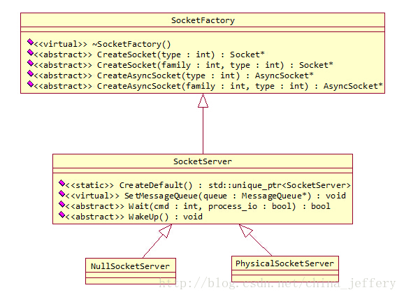 SocketServer是一个纯抽象类,NullSocketServerPhysicalSocketServer都派生自该类。NullSocketServer比较简单,没有创建SOCKET,只处理本地事件(CreateEvent系列函数);PhysicalSocketServer会创建SOCKET,并可以处理网络事件(WSACreateEvent系列函数)。在单纯的线程模型中,SocketServer只用于处理等待和唤醒操作。