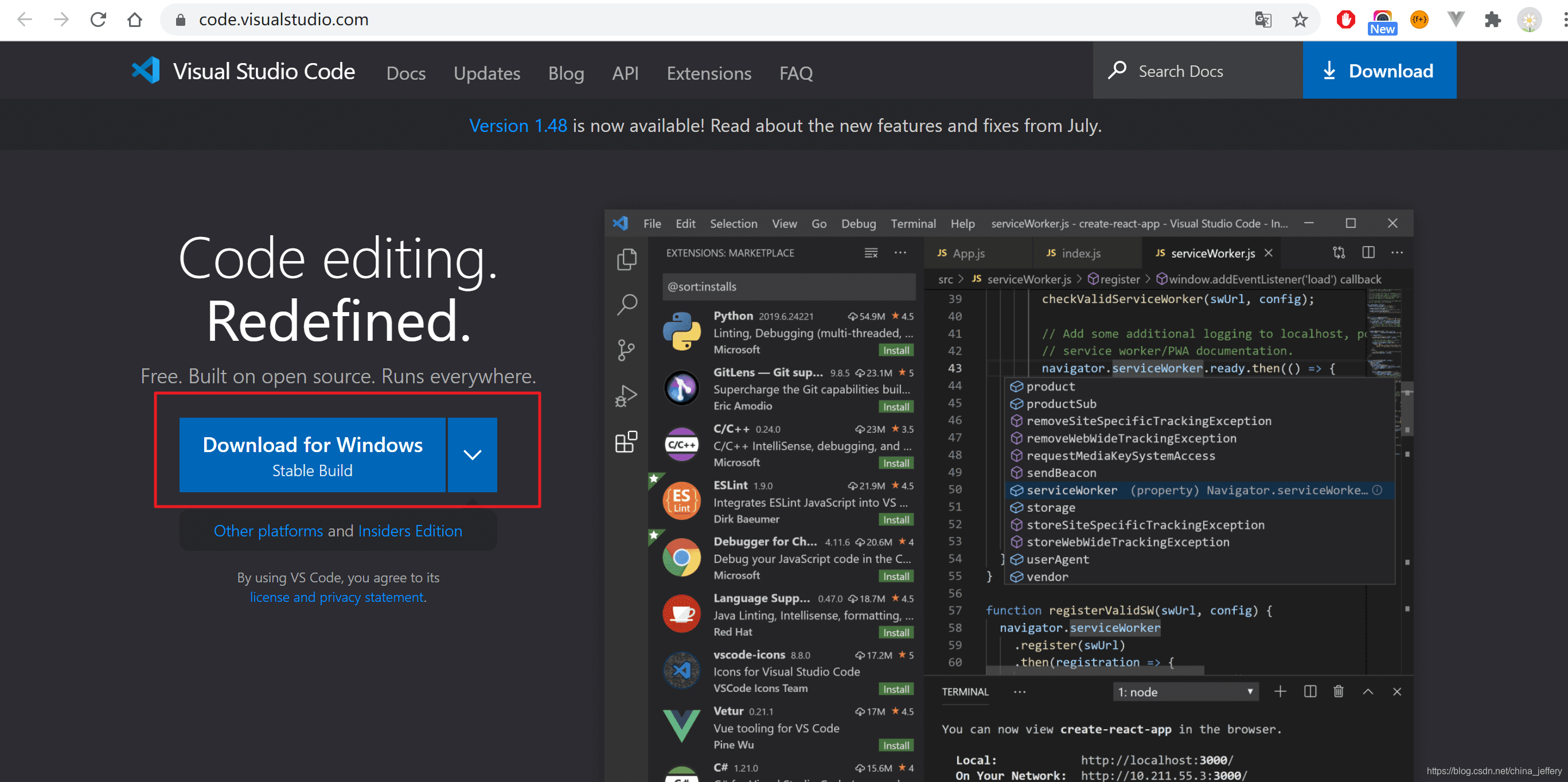 打开Visual Studio Code官网https://code.visualstudio.com/,根据系统选择对应的版本进行安装: