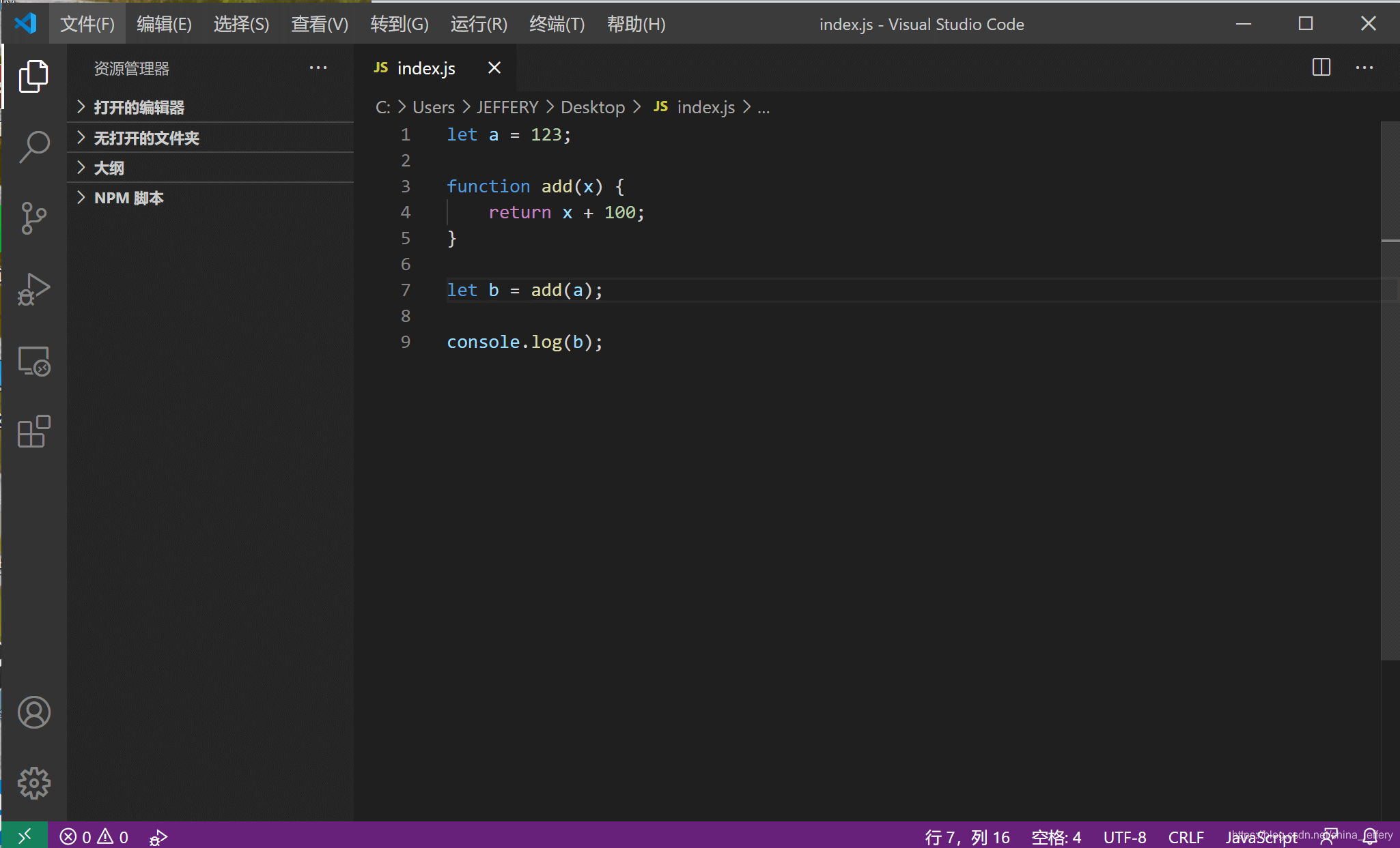 打开Visual Studio Code,新建一个JavaScript文件,输入任意JavaScript代码并保存,如: