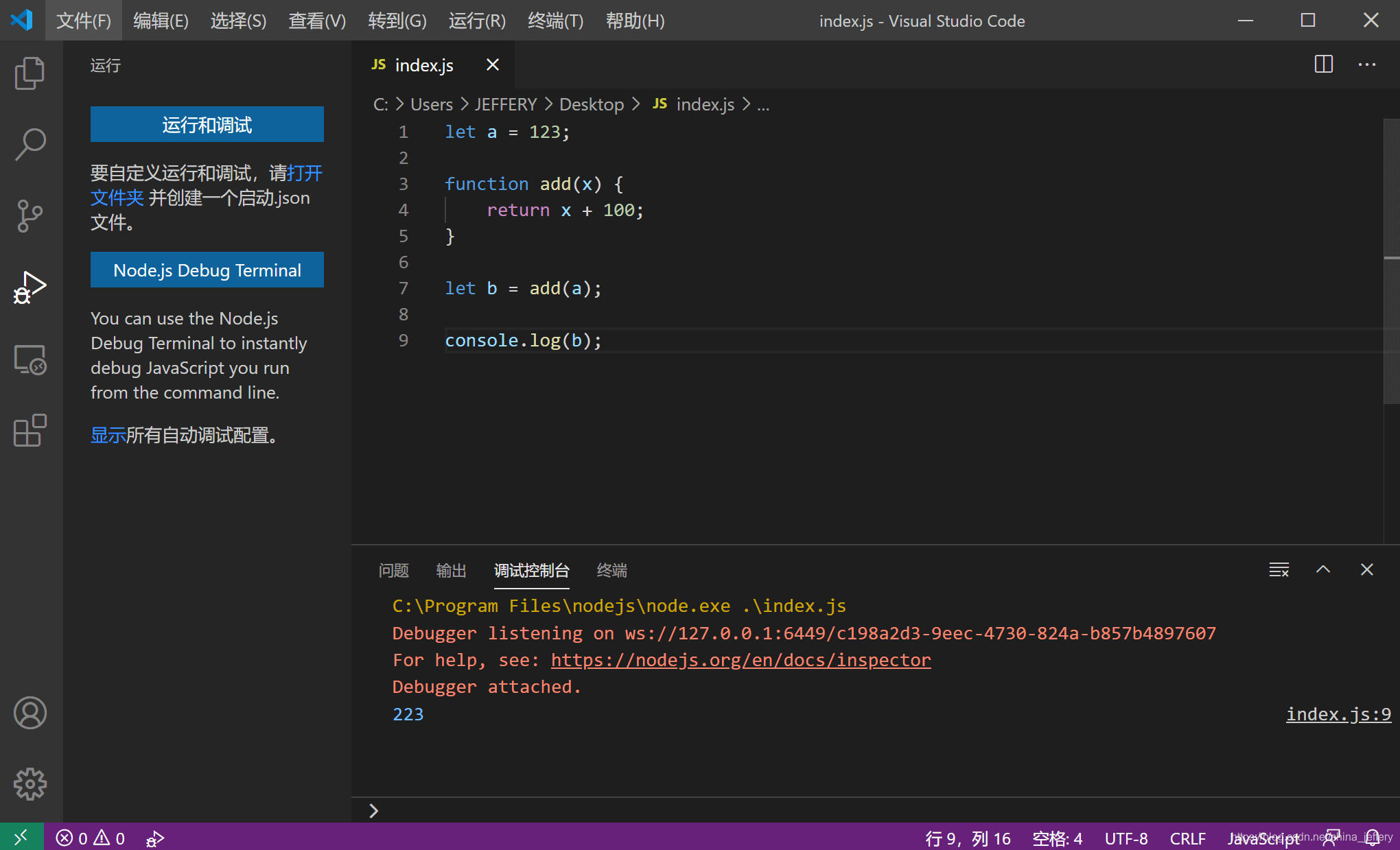 此时是看不到console.log的输出,因为其输出到了”调试控制台”,我们需要在“查看”菜单中打开“调试控制台”,再次使用上面步骤运行JavaScript文件即可在“调试控制台”看到运行的输出了。