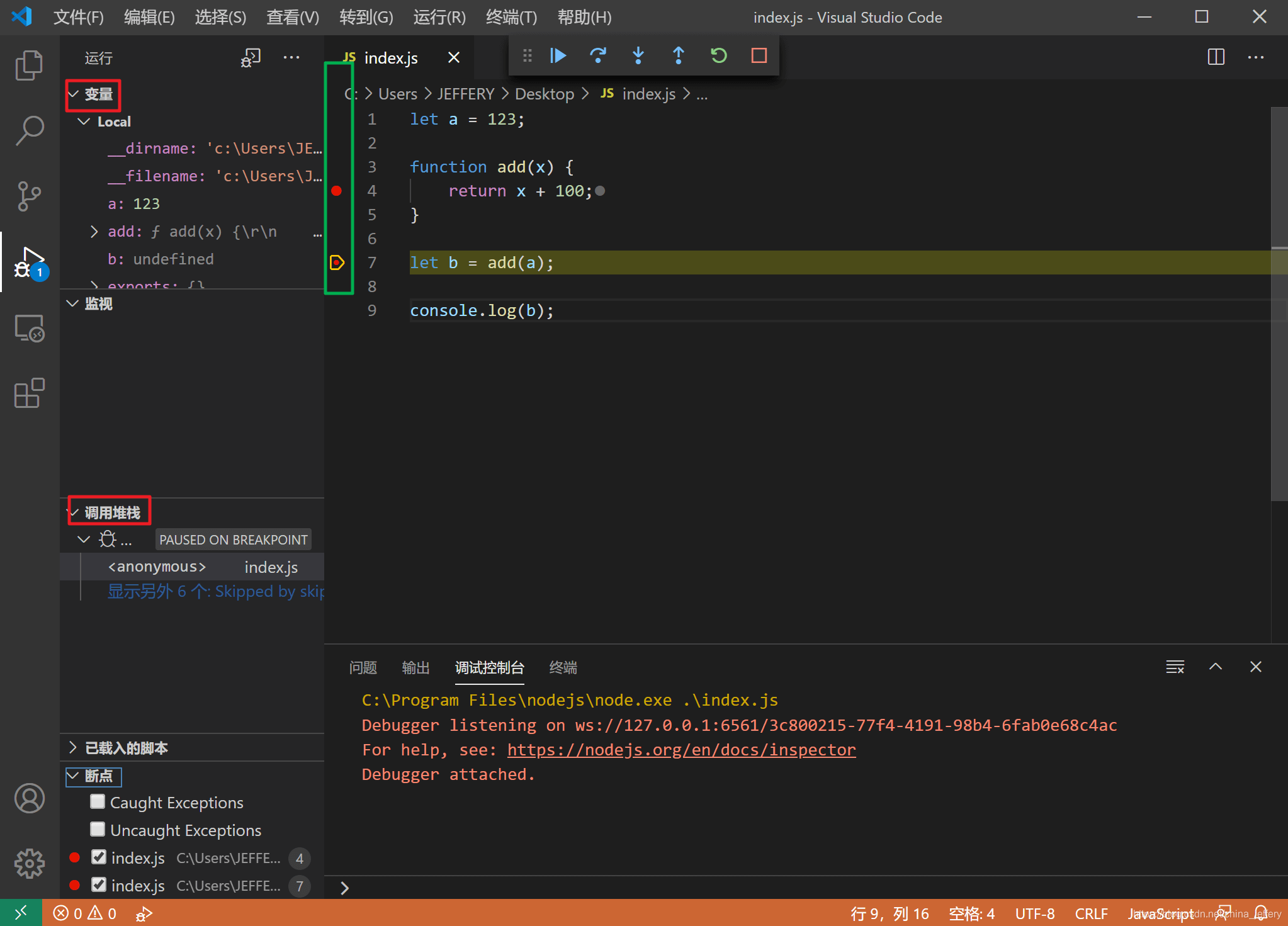 设置断点后,F5开始调试代码,代码运行到断点处便会暂停,此时我们可以在左侧区域查看当前上下文涉及的”局部变量”和”全局变量”、”调用堆栈”、以及”断点列表”。
